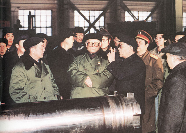 1990年2月17日中共中央總書記江澤民視察127廠時在車間聽取匯報