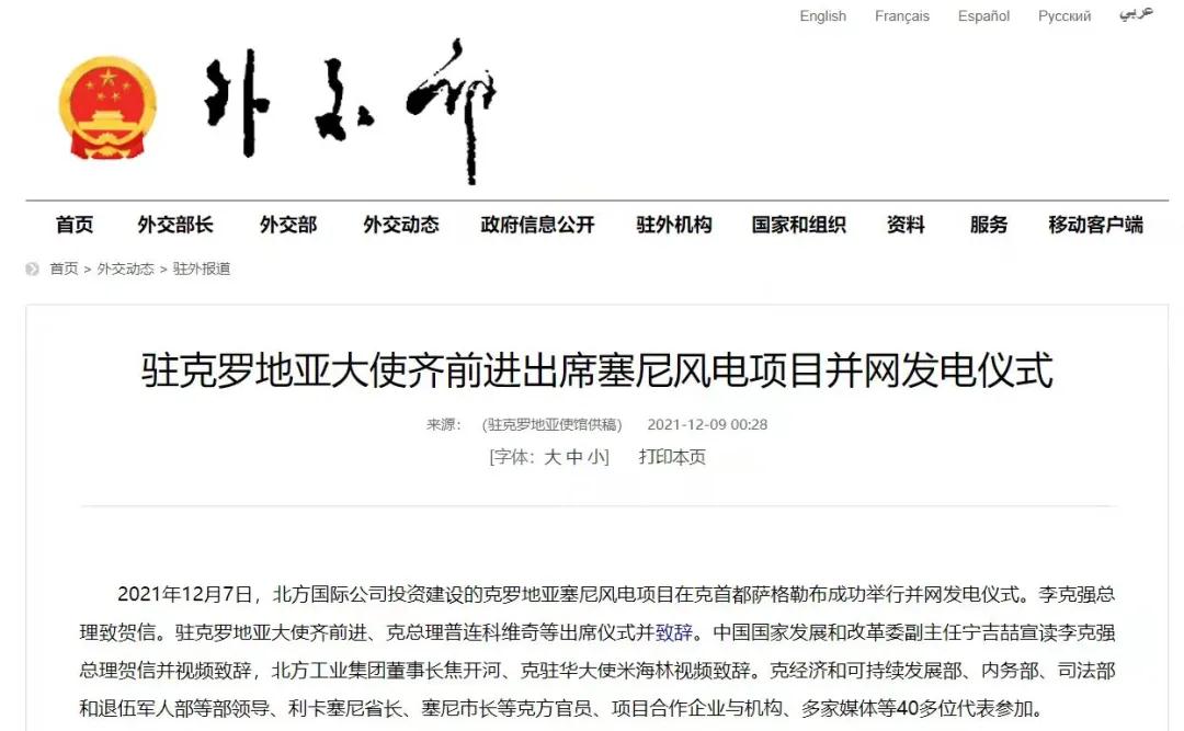 2021年12月7日,中國兵器工業(yè)集團有限公司北方公司所屬北方國際投資、建設(shè)和運營的塞尼156MW風(fēng)電項目在克羅地亞首都薩格勒布隆重舉行并網(wǎng)發(fā)電儀式。李克強總理致賀信??肆_地亞總理安德烈·普連科維奇,中國駐克羅地亞大使齊前進出席儀式并致辭。中國國家發(fā)展和改革委員會副主任寧吉喆宣讀李克強總理賀信并視頻致辭,中國兵器工業(yè)集團有限公司董事長焦開河、克駐華大使米海林視頻致辭。 中華人民共和國外交部報道 普連科維奇總理在致辭中表示,感謝李克強總理發(fā)來賀信,他與中國領(lǐng)導(dǎo)人一直非常重視塞尼風(fēng)電項目投資與建設(shè)。祝賀項目克服疫情與地震等影響,成功并網(wǎng)發(fā)電。增加清潔可再生能源、綠色電力對克乃至歐洲都很重要,克政府的重要戰(zhàn)略和目標(biāo)之一就是低碳發(fā)展和增加清潔能源供應(yīng)。塞尼風(fēng)電項目占克總發(fā)電量將達(dá)3.5%,對克實現(xiàn)2022年可再生能源比例30%目標(biāo)具有很大幫助。此次投資使北方國際成為在克最大的清潔能源投資企業(yè)。非常歡迎更多中國企業(yè)擴大對克投資。 寧吉喆宣讀李克強總理賀信并視頻致辭時表示,2017年11月第六次中國—中東歐國家領(lǐng)導(dǎo)人會晤期間,在李克強總理和普連科維奇總理等中東歐16國領(lǐng)導(dǎo)人的共同見證下,塞尼項目簽署了協(xié)議。項目既是中國堅定踐行綠色發(fā)展理念的具體體現(xiàn),也是中國深化與克羅地亞、與中東歐國家務(wù)實合作的生動實踐。希望中克兩國政府部門,企業(yè)等有關(guān)各方共同努力、相互配合,運營好塞尼項目,打造出中歐綠色合作的樣板,帶動兩國務(wù)實合作持續(xù)深入發(fā)展,造福兩國人民。 焦開河在致辭時表示,在塞尼項目投入運營之際,李克強總理專門致信祝賀。作為塞尼項目的投資方、建設(shè)方、運營方,我們備受鼓舞,深感自豪!未來,中國兵器工業(yè)集團有限公司將繼續(xù)深入貫徹落實習(xí)近平總書記重要指示批示精神和李克強總理賀信重要要求,以高標(biāo)準(zhǔn)、可持續(xù)、惠民生為目標(biāo),與克方合作伙伴坦誠溝通、攜手并進,進一步推動綠色能源建設(shè),努力打造更多的“一帶一路”標(biāo)志性、引領(lǐng)性、示范性項目,為鞏固中克戰(zhàn)略合作伙伴關(guān)系、推進中克從經(jīng)貿(mào)領(lǐng)域到全方位合作貢獻(xiàn)積極力量。 齊前進祝賀塞尼風(fēng)電項目順利完工和成功并網(wǎng)發(fā)電。他表示,塞尼風(fēng)電站項目并網(wǎng)發(fā)電是中克兩國領(lǐng)導(dǎo)人親自關(guān)注和推動的成果。作為迄今最大的中國在克投資合作項目,塞尼風(fēng)電項目是中克和中歐綠色合作的典范,對克提高清潔能源生產(chǎn)消費發(fā)揮著重要作用。項目建設(shè)過程中為當(dāng)?shù)嘏囵B(yǎng)了許多工程、技術(shù)和管理人才,帶動了當(dāng)?shù)仄髽I(yè)發(fā)展,增加了就業(yè)和稅收,促進了當(dāng)?shù)亟?jīng)濟社會發(fā)展,充分體現(xiàn)了中國對外經(jīng)貿(mào)合作與“一帶一路”倡議秉持的互利共贏、共同發(fā)展的理念,也是中國積極倡導(dǎo)的綠色低碳發(fā)展合作的典范。 塞尼項目位于克羅地亞中部亞得利亞海沿岸,建設(shè)總投資1.79億歐元,總裝機容量156MW,采用39臺4MW風(fēng)力發(fā)電機組設(shè)備,風(fēng)場面積達(dá)42.8平方公里。項目正式運營后,預(yù)計每年平均發(fā)電超3000小時,貢獻(xiàn)約5.3億度綠色電力,可減少二氧化碳排放約46萬噸,將為克羅地亞促進能源轉(zhuǎn)型、發(fā)展綠色經(jīng)濟提供強勁助力,貢獻(xiàn)了“中國智慧”“中國方案”。 來源/中華人民共和國外交部、綜合有關(guān)報道 |