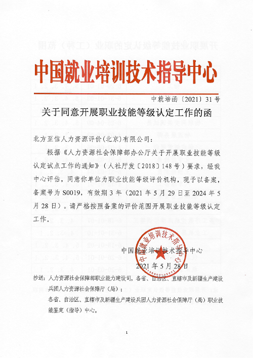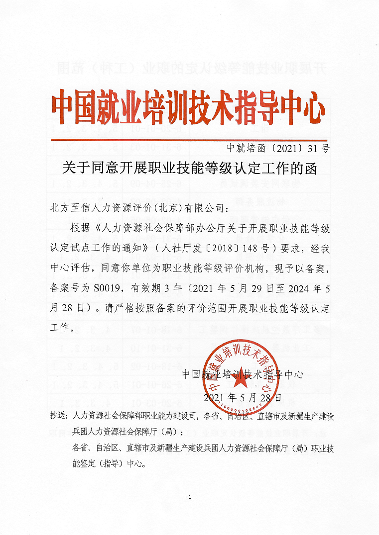 5月28日,人力資源社會保障部中國就業(yè)培訓技術(shù)指導中心發(fā)布了《關(guān)于同意開展職業(yè)技能等級認定工作的函》(中就培函〔2021〕31號),北方至信人力資源評價(北京)有限公司(以下簡稱“北方至信”)成為首家央企全國性社會培訓評價組織職業(yè)技能等級認定機構(gòu)。