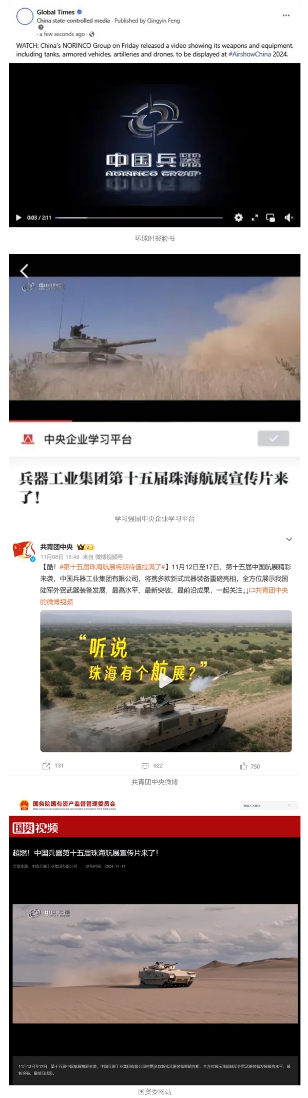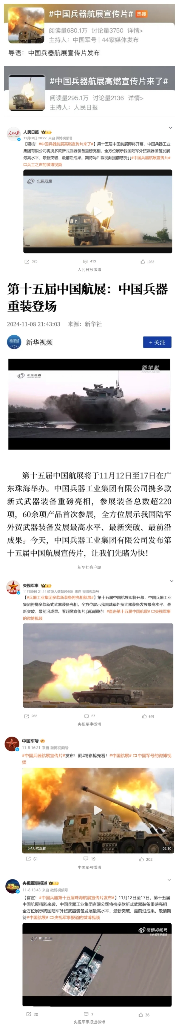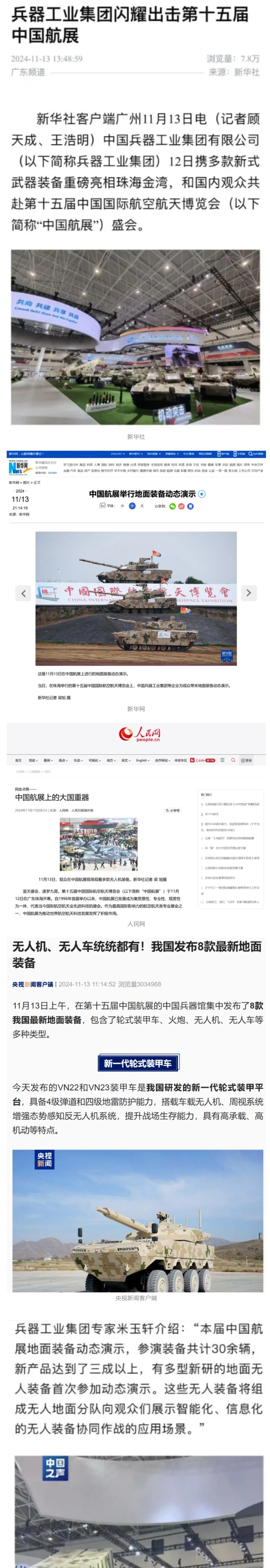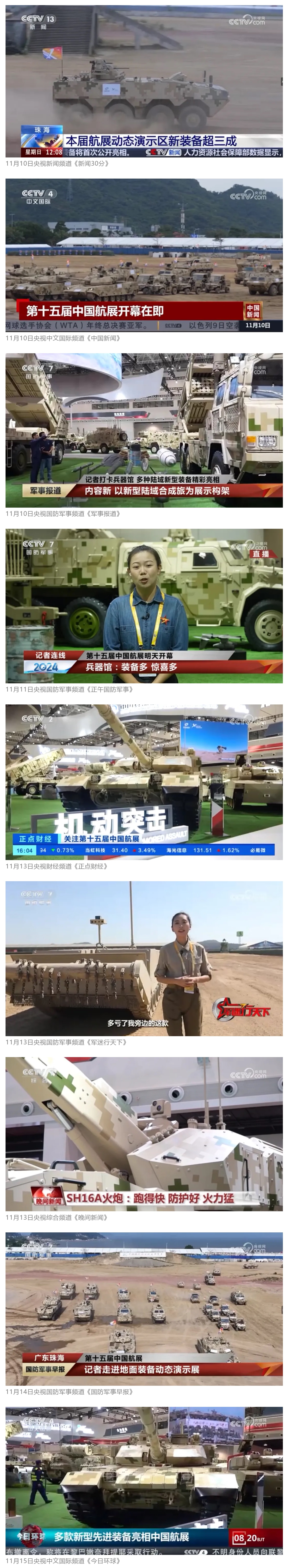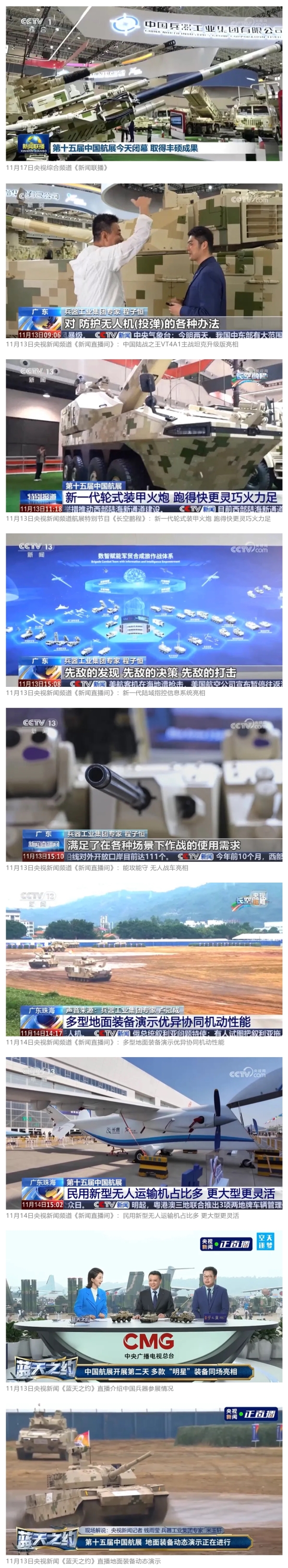 11月13日央視新聞《藍(lán)天之約》直播地面裝備動(dòng)態(tài)演示此次航展,央視綜合頻道《新聞聯(lián)播》《晚間新聞》、新聞?lì)l道《新聞直播間》《新聞30分》《朝聞天下》《共同關(guān)注》《東方時(shí)空》《午夜新聞》、財(cái)經(jīng)頻道《天下財(cái)經(jīng)》《經(jīng)濟(jì)信息聯(lián)播》《正點(diǎn)財(cái)經(jīng)》《第一時(shí)間》、中文國(guó)際頻道《今日環(huán)球》《中國(guó)新聞》、國(guó)防軍事頻道《軍事報(bào)道》《正午國(guó)防軍事》《國(guó)防軍事早報(bào)》《軍迷行天下》等欄目共播出兵器工業(yè)集團(tuán)參展相關(guān)新聞報(bào)道40余條。11月10日央視新聞?lì)l道《新聞30分》11月10日央視中文國(guó)際頻道《中國(guó)新聞》11月10日央視國(guó)防軍事頻道《軍事報(bào)道》11月11日央視國(guó)防軍事頻道《正午國(guó)防軍事》