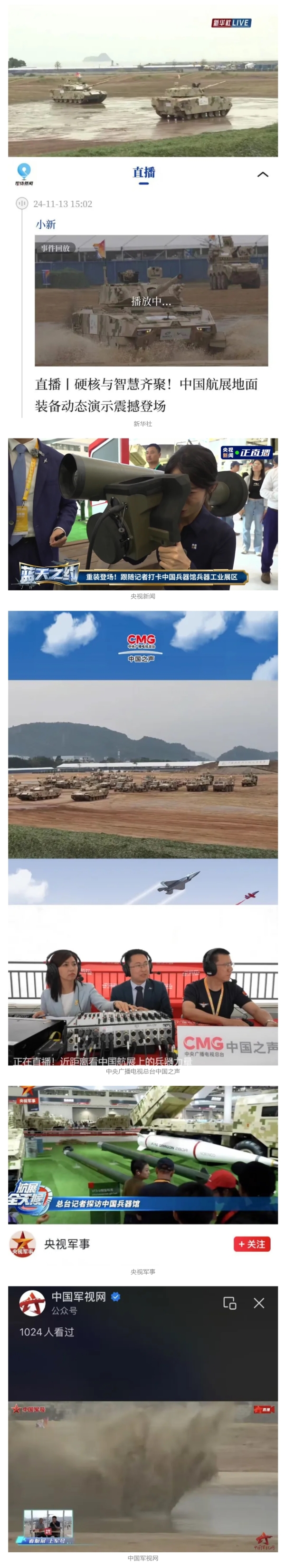 新華社、央視新聞、中央廣播電視總臺(tái)中國(guó)之聲、央視軍事、中國(guó)軍視網(wǎng)、廣東廣播電視臺(tái)等媒體以及國(guó)家國(guó)防科工局、國(guó)資小新等到兵器工業(yè)集團(tuán)地面動(dòng)態(tài)演示區(qū)、中國(guó)兵器館進(jìn)行了直播。