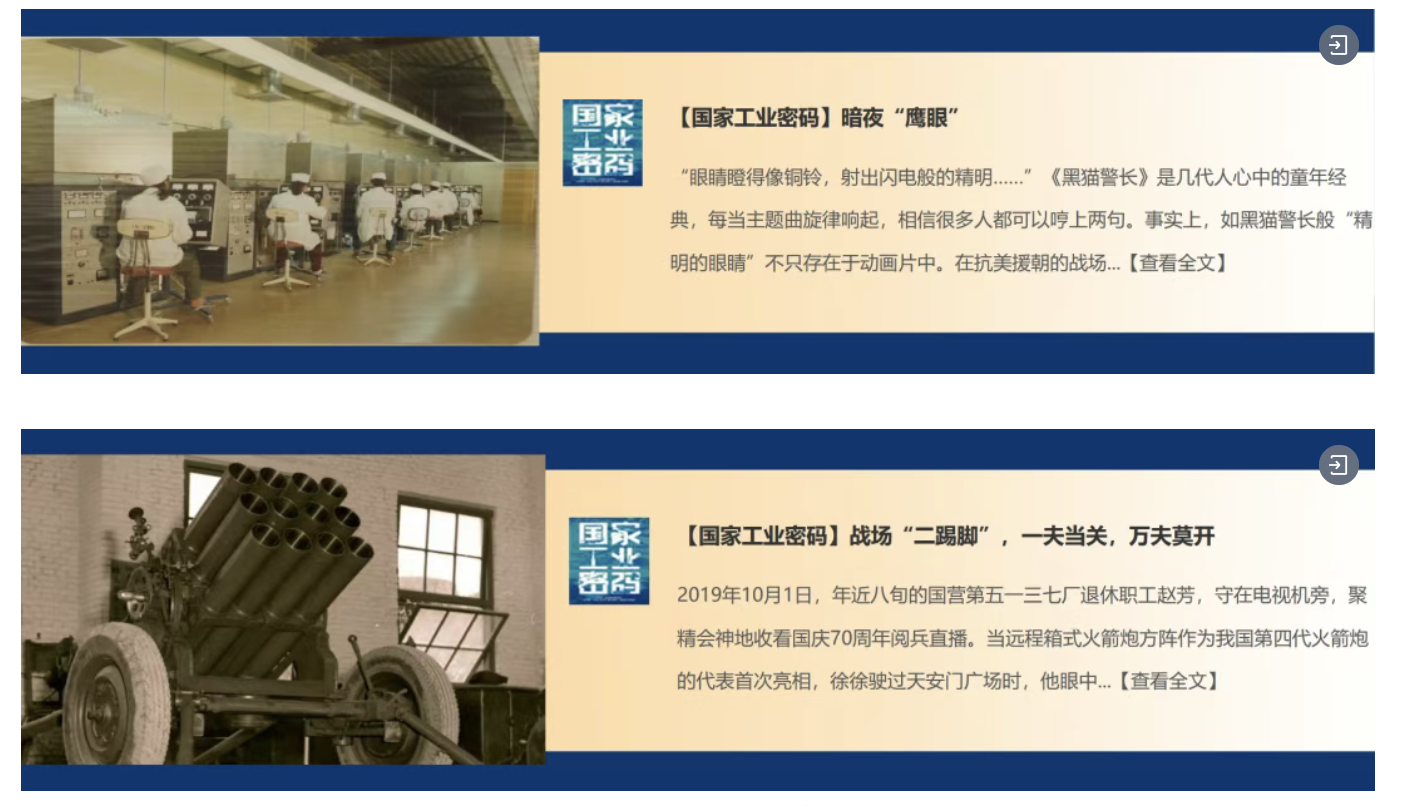 兵器工業(yè)集團參與國務院國資委新聞中心聯(lián)合新華網(wǎng)、云聽APP、喜馬拉雅APP、機械工業(yè)出版社推出的《國家工業(yè)密碼》——有聲故事網(wǎng)絡互動傳播活動,刊發(fā)《暗夜“鷹眼”》《戰(zhàn)場“二踢腳”,一夫當關,萬夫莫開》。