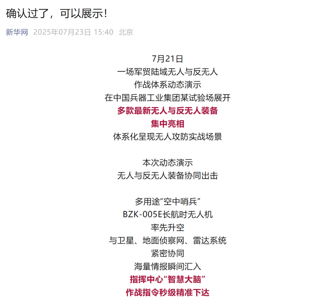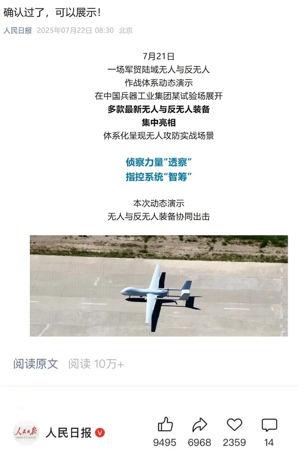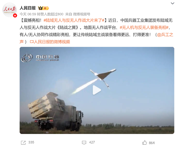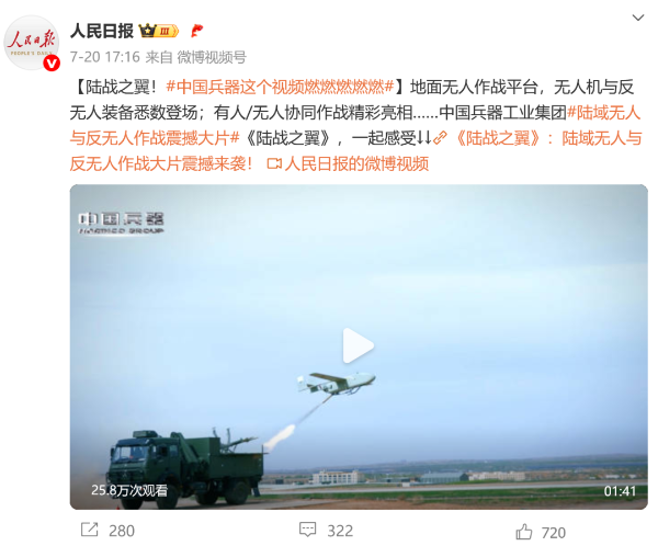 7月21日,中國兵器工業(yè)集團有限公司在位于內蒙古的某試驗場舉辦軍貿陸域無人與反無人作戰(zhàn)體系主題日活動,攜無人機、巡飛彈、反無人機等最新武器裝備登場亮相,展現(xiàn)了一場無人與反無人領域激烈對抗的實戰(zhàn)場景。中央主流媒體、地方媒體、知名網(wǎng)絡媒體,以及集團公司各宣傳平臺紛紛進行報道,多次登上熱搜,引發(fā)廣泛關注。 央視新聞頻道《新聞直播間》《東方時空》《24小時》、國防軍事頻道《正午國防軍事》《軍事報道》《國防軍事早報》、中文國際頻道《今日環(huán)球》、央視軍事新媒體等報道了集團公司軍貿陸域無人與反無人作戰(zhàn)體系首次公開實裝動態(tài)演示有關情況,重點介紹了無人與反無人作戰(zhàn)最新裝備。 央視新聞頻道《新聞直播間》:內蒙古 軍貿陸域無人與反無人作戰(zhàn)最新裝備亮相 央視新聞頻道《新聞直播間》:內蒙古 軍貿陸域無人與反無人作戰(zhàn)最新裝備亮相 記者探訪無人裝備展區(qū) 央視新聞頻道《新聞直播間》:軍貿陸域無人與反無人作戰(zhàn)最新裝備亮相·記者探訪 最強“盾牌” 反無人機系統(tǒng)新升級 人民日報微博、央視軍事微博、央視新聞客戶端、中國新聞網(wǎng)、中新社國是直通車抖音、環(huán)球網(wǎng)微博、環(huán)球時報(X平臺、英文版客戶端)、中國日報網(wǎng)、央視軍事報道微博、中國軍號微博、中央廣播電視總臺“空天逐夢”微信視頻號、共青團中央B站、國資小新微博等中央主流媒體、國家部委的新媒體播發(fā)集團公司陸域無人與反無人作戰(zhàn)大片等視頻作品。 人民日報微博 央視軍事微博 人民日報、新華網(wǎng)、央視軍事、央視新聞、中央廣播電視總臺中國之聲、中國新聞網(wǎng)、中國日報網(wǎng)、中國日報英文報刊《CHINA DAILY》、《科技日報》、光明日報客戶端、環(huán)球網(wǎng)、環(huán)球時報、人民日報海外版-海外網(wǎng)、央視網(wǎng)、小央視頻、參考消息、瞭望東方周刊、共青團中央、國資小新新媒體、新浪網(wǎng)、騰訊網(wǎng)、搜狐網(wǎng)、鳳凰網(wǎng)、網(wǎng)易網(wǎng)等中央主流媒體、國家部委的新媒體及知名網(wǎng)絡媒體對集團公司軍貿陸域無人與反無人作戰(zhàn)體系主題日活動進行了圖文、音頻、視頻報道。 央視軍事微信 人民日報微信 新華網(wǎng)微信 來源/各主流媒體 |